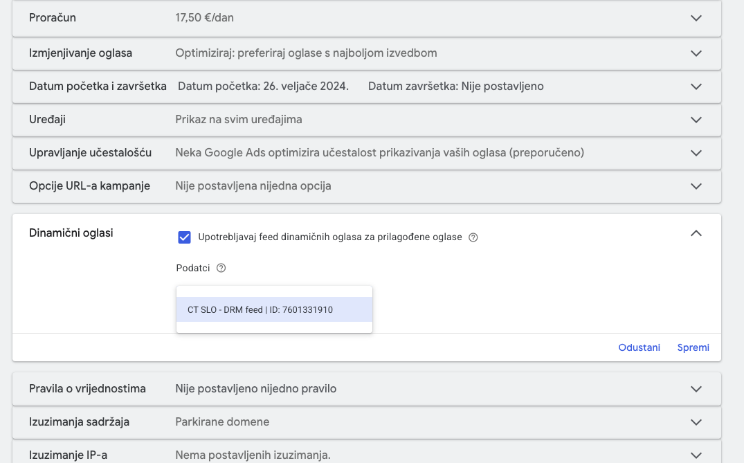 - Postavke dinamičkih oglasa - ovo je ključan korak koji se često previdi. Unutar postavki kampanje (pod stavkom More settings), morate označiti opciju “Upotrebljavaj feed dinamičnih oglasa za prilagođene oglase”.