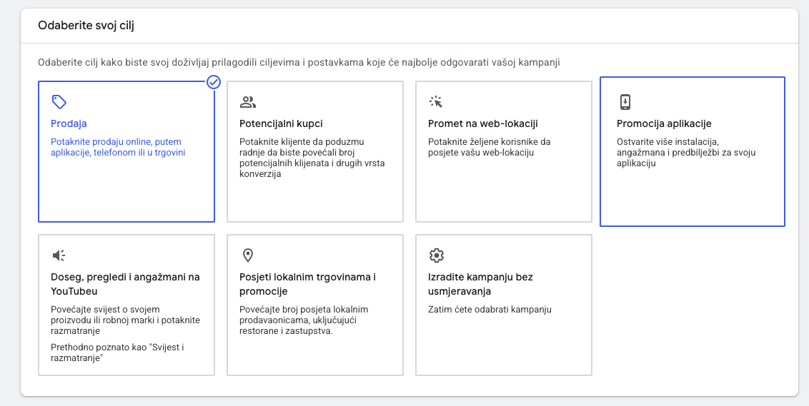 - Odabir cilja - kliknite na gumb za novu kampanju i odaberite cilj Prodaja ili Potencijalni klijenti.