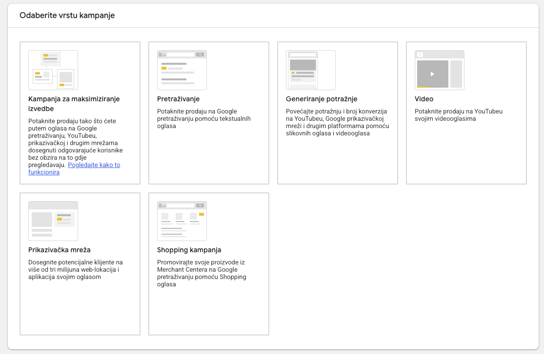 - maloprodajne - ova vrsta kampanja koristi Google Merchant Center. Iako je Merchant Center do sada bio ograničen, prema službenim najavama s Think Consumer CEE eventa u Varšavi, Google Shopping Ads i potpuna funkcionalnost Merchant Centra stižu u Hrvatsku i regiju (Srbija, BiH, Slovenija) u četvrtom kvartalu (Q4). To znači da će domaći web shopovi uskoro moći koristiti puni potencijal automatiziranog maloprodajnog oglašavanja.
