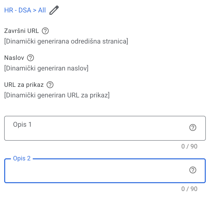Vi kao korisnik Google Ads sustava trebate upisati samo opise i eventualno display URL, a sustav će s obzirom na pretraživanje korisnika generirati naslove i odredišnu stranicu.