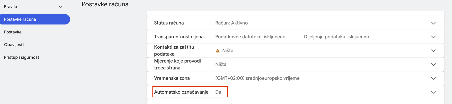 3. Isključen je auto-tagging URL-ova na računu za Google Ads