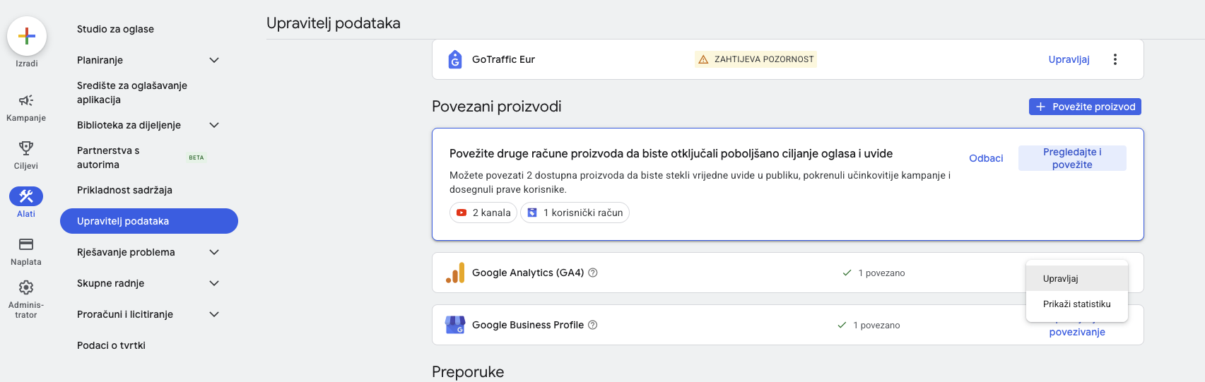 Da biste provjerili ovu stavku idite na svoj račun i izborniku s lijeve strane kliknite na “Alati”. Pod “Upravitelj podataka” odaberite opciju “Povezani proizvodi”. Pronađite Google Analytics, kliknite na 3 točkice i odaberite “Upravljaj”.