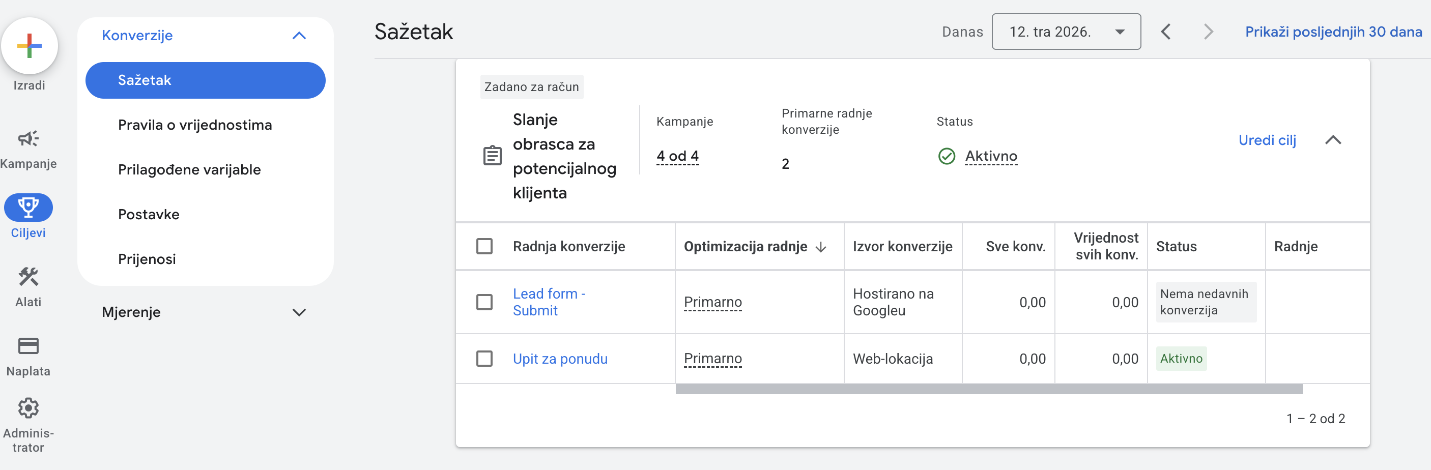 Da biste provjerili kako su vam akcije konverzija označene idite na svoj Google Ads račun, a zatim u izborniku na lijevoj strani na “Ciljevi” - “Konverzije” - “Sažetak”. Tamo možete vidjeti i urediti način brojanja za svaku konverzijsku radnju.