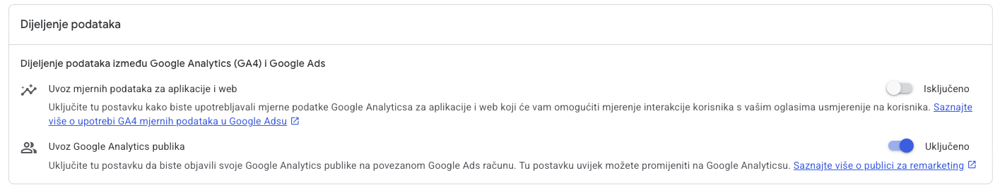 - uvoziti konverzije iz GA4 (Events označene kao Conversions) u Google Ads radi preciznog praćenja kampanja i optimizacije licitiranja