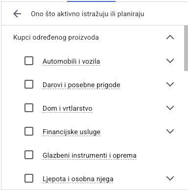 Ova opcija ciljanja omogućuje prikazivanje oglasa ljudima za koje Google pretpostavi da su spremni za kupnju. Ova skupina aktivno pregledava, istražuje i uspoređuje vrste proizvoda koje nudimo.