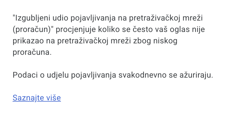 Izgubljeni udio pojavljivanja na pretraživačkoj mreži (proračun) odnosi se na postotak vremena tijekom kojeg se vaši oglasi nisu prikazivali zbog preniskog proračuna.