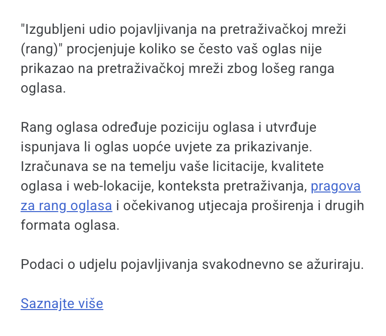 S druge strane, Izgubljeni udio pojavljivanja na pretraživačkoj mreži (rang) odnosi se na postotak vremena tijekom kojeg se vaši oglasi nisu prikazivali na pretraživačkoj mreži zbog niskog ranga oglasa na dražbi.