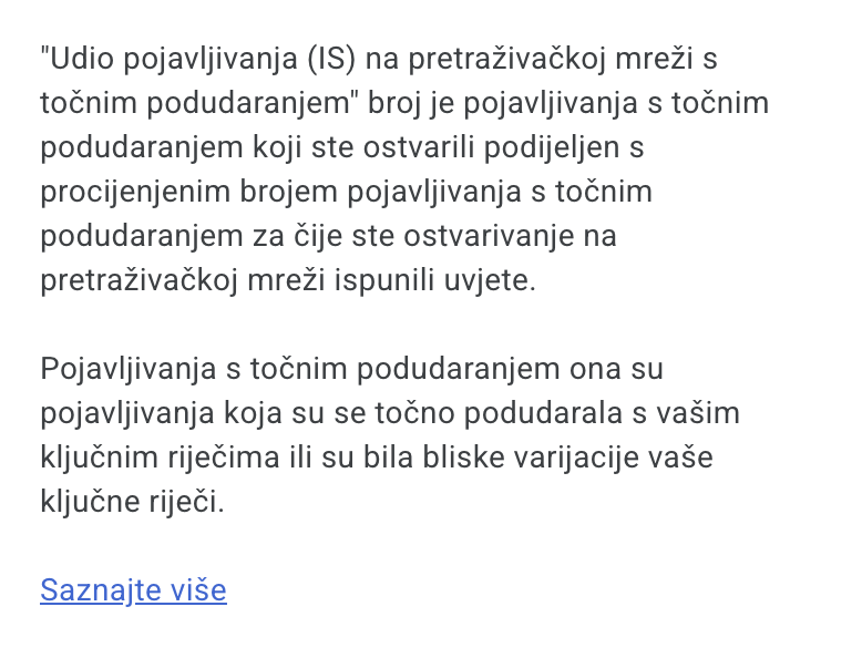 Upravo zato Search Exact Match IS služi kao svojevrsni “kontrolni pokazatelj” - govori vam koliko dobro pokrivate najrelevantnije i najvrijednije pretrage, neovisno o širem dosegu koji dobivate kroz broad match. Ako je ovaj udio nizak, to može značiti da gubite najkvalitetniji promet zbog budžeta ili Ad Ranka, čak i ako ukupni promet izgleda zadovoljavajuće.