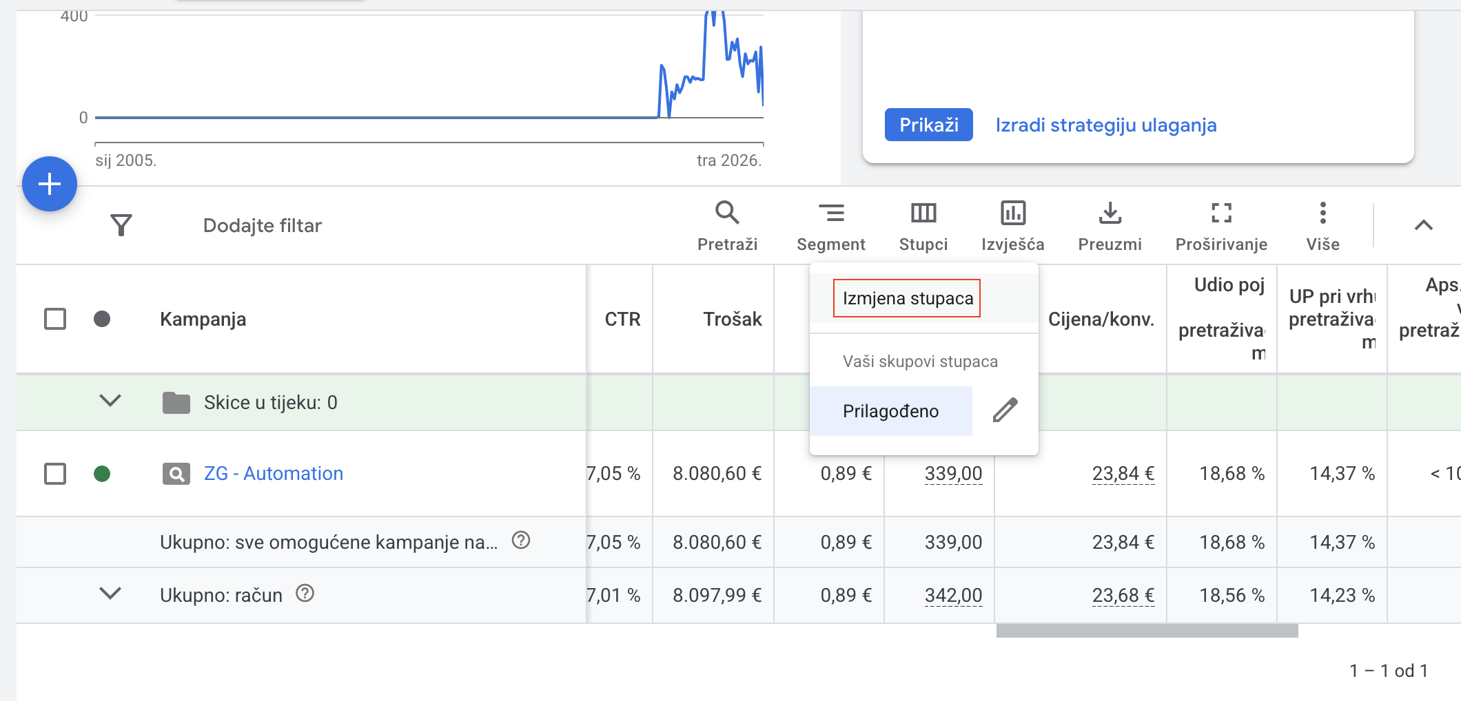 Ovi podaci dostupni su i za stopu pojavljivanja na vrhu stranice te na apsolutnom vrhu, a možete ih pronaći a razini kampanje.