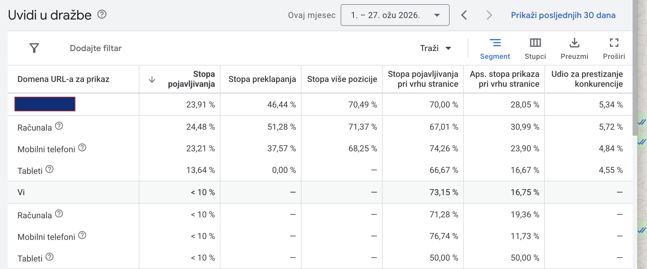 Primjerice, ako konkurent ima udio pojavljivanja od 90%, a vi manje od 10%, to može ukazivati na to da konkurent ima veću vidljivost – što može biti rezultat viših licitacija, većeg budžeta ili bolje kvalitete oglasa.