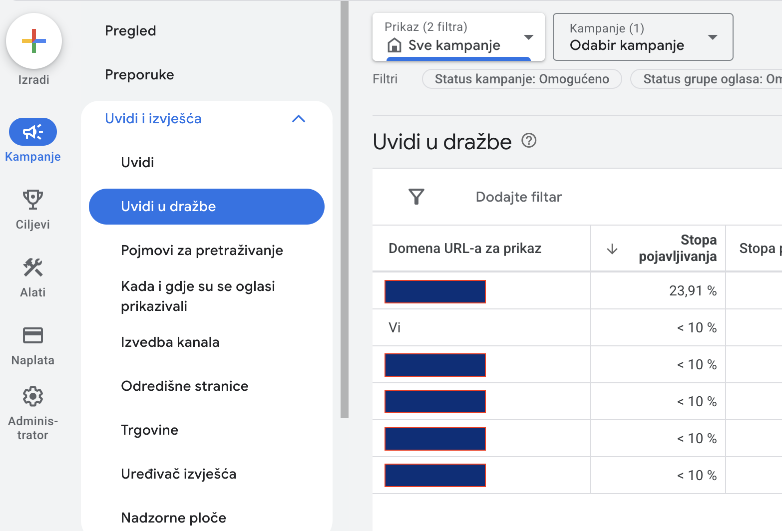 Uvidi u dražbe iznimno su korisno izvješće koje vam može ponuditi odgovore na velik broj pitanja vezanih uz konkurenciju. Ne bojte se istraživati, filtrirati i klikati unutar izvješća – to bi vas moglo dovesti do nekih izvrsnih spoznaja koje će vam olakšati daljnje oglašavanje.