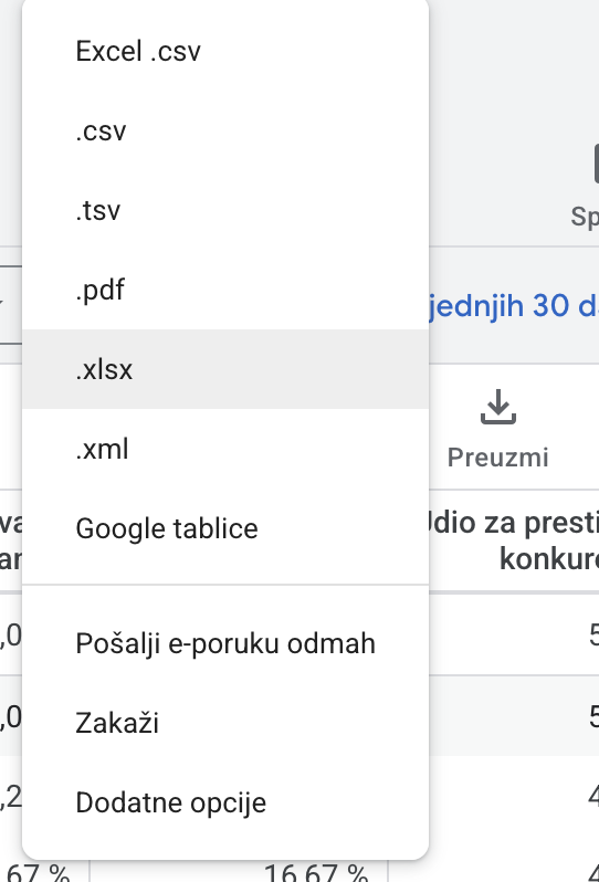 Ako želite preuzeti izvješće, kliknite na opciju „Preuzmi” u gornjem desnom kutu izvješća, a zatim format u kojem želite preuzeti.